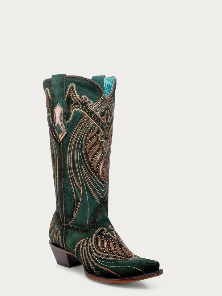 WOMEN'S OVERLAY EMBROIDERY AND STUDS GREEN SNIP TOE COWBOY BOOTS A4714