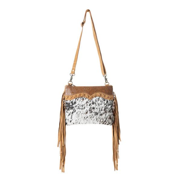 Crafted for the cowgirl with bold taste, the Myra Timber Trail Hairon Bag in Burnished Bronze & Soft Porcelain blends rugged elegance with show-stopping detail. This standout piece from our hair on hide handbags collection features luxe western leather embossed with rich tooling, complemented by a naturally spotted hairon body. The layered fringe sways with every step, while its compact shape keeps it light yet functional. For lovers of authentic craftsmanship, this is one of the most striking Western leather handbags to elevate your ensemble.