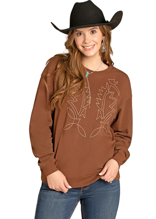 100% Cotton; Long Sleeves; Crew Neck; Contrast Boot Stitch Embroidered Design On Front; Distressed Wash; Style #BW91T07780